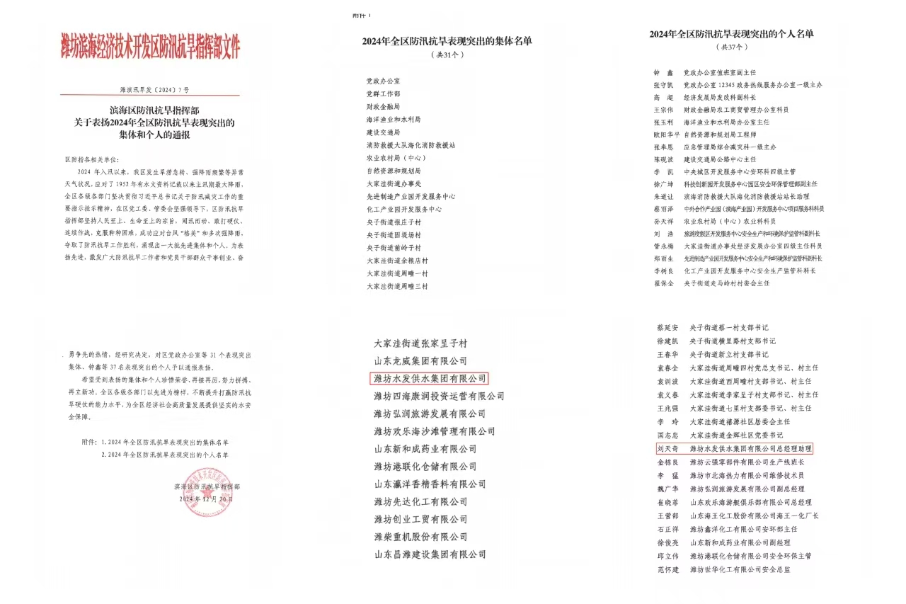 近日,濰坊市濱海區(qū)防汛抗旱指揮部下發(fā)《關于表揚2024年全區(qū)防汛抗旱表現(xiàn)突出的集體和個人的通報》,濰坊水發(fā)供水集團及公司員工劉天奇,分別榮獲防汛抗旱表現(xiàn)突出的集體和個人表彰。